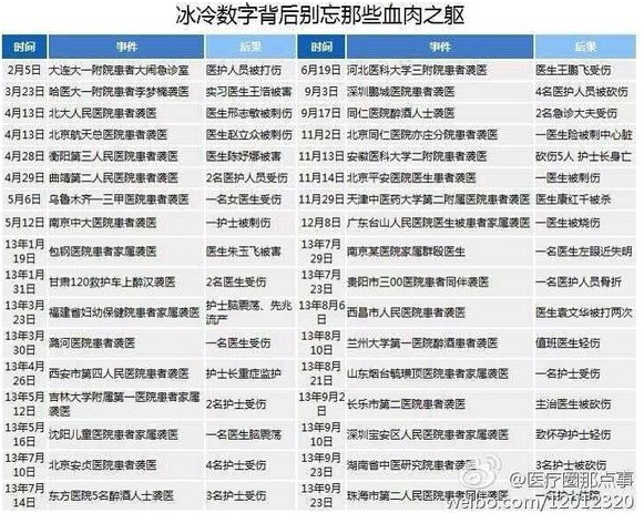这是某网站统计的2013年几大经过报道的恶性伤医事件的汇总。过去一年,许多无辜的同行因为医院暴力事件受伤,甚至失去宝贵的生命。然而从语言暴力到拳打脚踢,甚至拔刀杀医。愈演愈烈的医院暴力事件一次次伤害着医生的身体和心灵,紧张的医患关系和大家逐渐麻木的态度更让医者内心充满阴霾,成为对中国六百多万医者的严峻考验。这冰冷的数字背后,透露着多少医务人员的无奈?