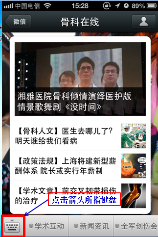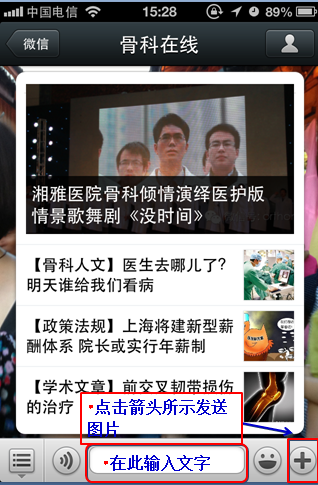 发送途径1:直接从骨科在线微信的对话框输入文字或者图片回复。如下图所示: