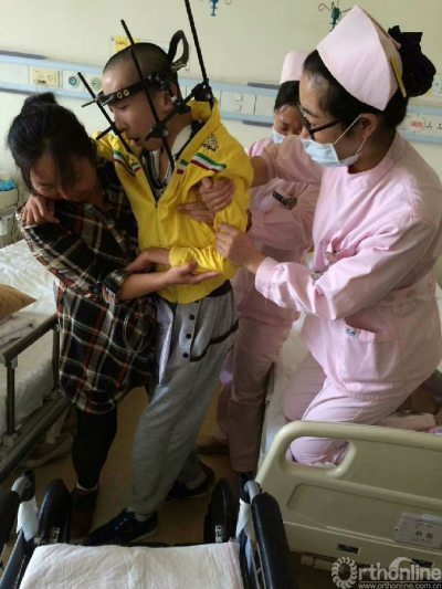 因为治疗需要,一个月后医生给他带了哈伦架,有助于固定他的颈椎从而更好的康复。从此以后,除了翻身、扣背、排痰、被动活动下肢等护理工作之外,还要对他进行针眼消毒、擦洗哈伦架背心等。经过六个月精心的护理治疗,目前他左腿和右手已经恢复活动能力,自己能够完成翻身、辅助患侧肢体的被动活动等。整个人的情绪也变得开朗起来,笑容渐渐地多了。