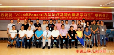 南医三院儿童骨科团队,自2011年成立至今,在李旭主任的带领下,已经运用Ponseti方法成功治愈马蹄内翻足患儿超过1200例。南医三院儿童骨科始终积极致力于马蹄内翻足Ponseti治疗方法的推广工作,于2014年8月15-16日与Ponseti国际协会(PIA)、上海交通大学医学院附属新华医院联合举办了“2014年国际先天性马蹄内翻足Ponseti(潘塞缇)疗法专题学习班”,邀请了美国Iowa大学医学院的著名小儿骨科专家Morcuende教授、泰国曼谷Ramathibodi医学附属医院骨科Amnuay教授、上海交通大学附属新华医院儿童骨科主任赵黎教授、南方医科大学第三附属医院儿童骨科李旭教授等对Ponseti方法治疗马蹄内翻足进行专题讲座和操作演示,设立了展台与workshop环节,吸引了来自广东省及周边地区的近百位骨科医师前来参会学习交流,给他们提供了一个规范使用Ponseti方法治疗马蹄内翻足的机会,为在南方地区普及Ponseti方法的治疗理念,提高骨科医师和儿童骨科医生对于先天性马蹄内翻足的诊断和治疗水平起到了积极的作用。