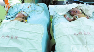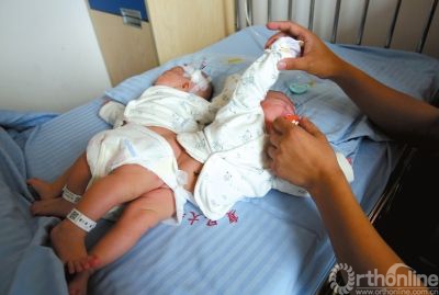 这对连体女婴于3月17日出生,出生后3天即转至上海救治。经检查显示,患儿臀部软组织相连,骶尾骨相连,椎管相连。两个女婴共用一个肛门,肛门开口处共用一段长度小于1厘米的肛管,上方有各自的消化道。