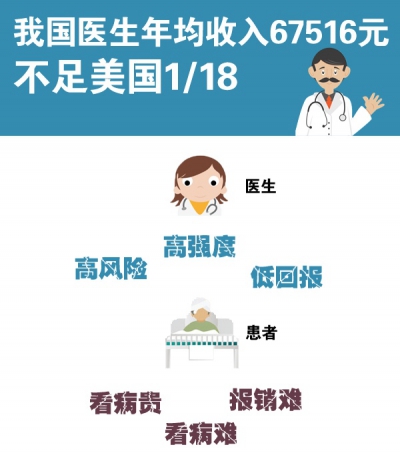 医生感慨自己的职业“高风险、高强度、低回报”,患者却抱怨看病贵看病难。如果说医生收入不高,普通百姓大概很难接受。近日,《中国医师执业状况白皮书》发布,我国医生年均收入为67516元,不足美国的1/18,在全国也只是中等水平。