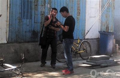 6月20日,平安里育德胡同,男子(左)正给家里打电话让汇钱,“医托”守在其旁边。