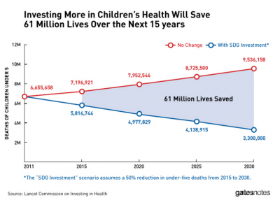 看看世界已经取得什么成就。从1990年,我们将5岁之前死亡人数降低一半(从约为 10% 降为 5%)。而我乐观的预测,到2030年,我们可以把这个数据再砍一半,这将使 6100 万儿童免受死亡: