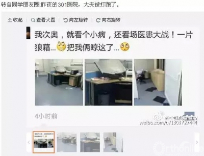微博网友@小贱贱贾贾贾 7月15日早上发了一篇微博:转自同学朋友圈:昨夜的301医院,大夫被打跑了。(图如下)