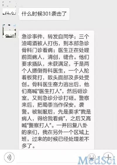 急诊事件,转发自同学:三个渣喝酒被人打伤,到本部急诊骨科门诊看病;医生正在处理前面病人,清创,缝合。他们要求插队,未获满足,于是两个人摁倒骨科医生,一个人抡着板凳打,致头面部及多处受创。骨科医生奋力逃出后,他们高喊“医生打人”,然后砸诊室,又到急诊分诊打砸。警察来后,把蜀黍当作保安,袭警。被制服后,先是要求“我是病人,得给我看病”,之后又高喊“警察打人”。一并回复八卦的亲们,我在另外一个区域上班,过来的时候已经处理差不多了。