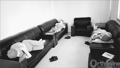 吃完午饭,孙家明坐在食堂外边的沙发上休息。这个周末,他要到上海参加中国医师协会举办的一个论文审稿会。“对我来说,开会就算是休息。”正说着,孙家明已经难掩睡意,躺到了沙发上。不一会儿,鼾声响起。