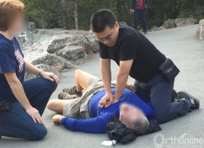 23日恰逢周日,刘博士前往黄石公园游览。下午7点,行经一处景点时,突然听到呼救声音。他循声望去,见一位老年游客正在地上抽搐。刘博士赶紧上前,发现老人心跳呼吸骤停后,立即为他进行徒手心肺复苏,并请周边的游人赶紧拨打急救电话。
