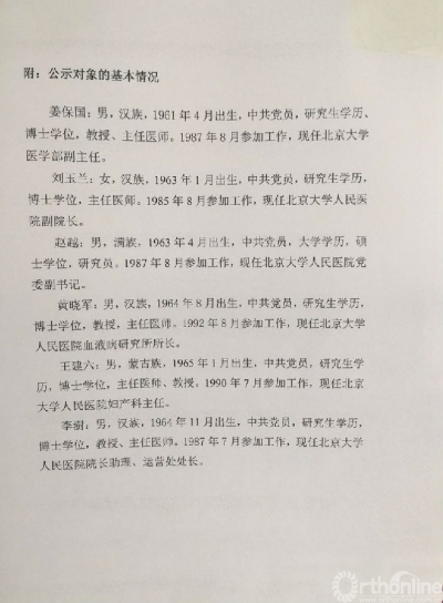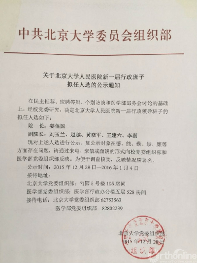 昨日,北京大学人民医院行政领导班子换届工作发布公示,新一届行政班子拟任人选结果公布如下,北大医学部副主任、北京大学人民医院创伤骨科主任姜保国拟任北京大学人民医院院长,刘玉兰、赵越、黄晓军、王建六、李澍为副院长。