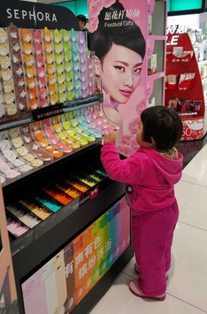 今天我特意陪她去逛街。街上灯红酒绿,俊男靓女。她一进商店,就像所有女孩子一样,上足了发条,看看这个,摸摸那个。在一堆女孩子之间翻看物品。对于化妆品的花花绿绿更是爱不释手。