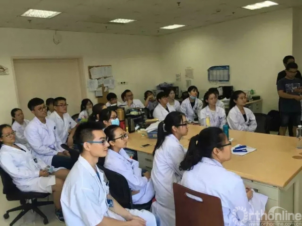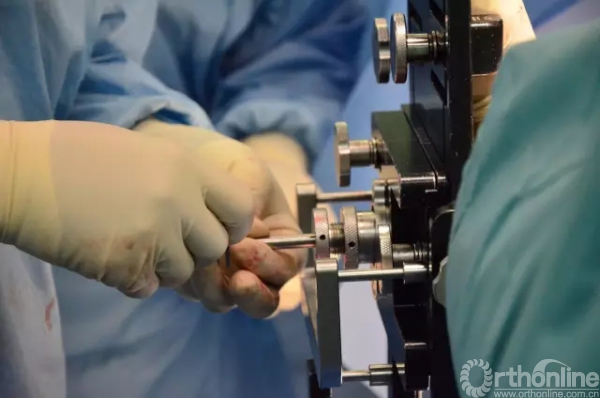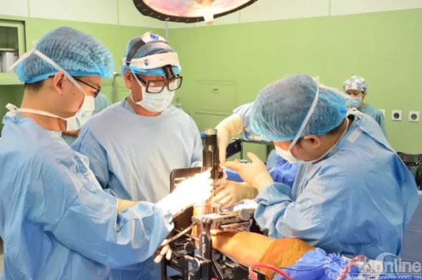 2016年7月25日上午瑞金医院北院1号手术间手术紧张有序地进行着,由徐向阳主任主刀,胡牧、郭常军、徐财军医师担任助手,张海军医师负责术中透视,苏丹为器械护士,施雨婷为巡回护士,杨利英护士长全程协调,麻醉师王智渊保障手术顺利进行,所有人通力协作、配合默契。同时在技术人员协助下实现手术实况转播,其他医生在病区医生办公室观摩手术。