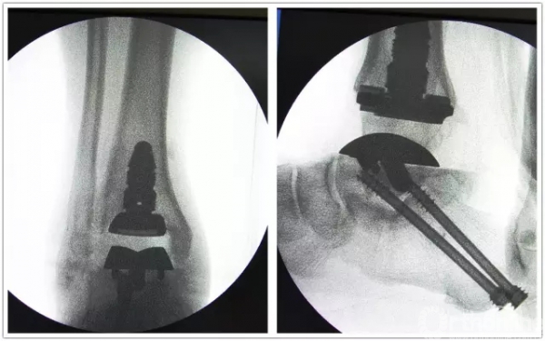 手术中首先沿原手术切口进入,保护神经血管肌腱组织,清理踝关节假体周围骨赘,取出原关节假体,将患足置于专门的定制支架中,在透视下反复调整足踝及导针位置,力求最高精确度。在导板的定位下进行胫骨远端和距骨截骨,试样假体大小,置入合适匹配的踝关节假体及垫片完成全踝关节假体的置换,然后再行距下关节融合术。历经4小时,手术过程非常顺利,术后患者恢复良好,手术取得圆满成功。