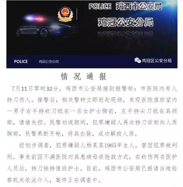 7月11日凌晨,黑龙江省鸡西市人民医院劫持医务人员暴徒被公安民警当场击毙。