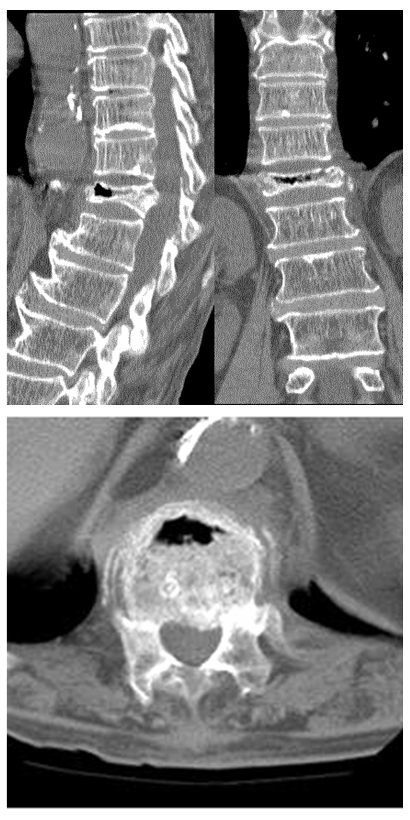 ③在CT片上:矢状位和冠状位可见椎体内存在裂缝。与Xray片相比,裂隙更加不均匀、不规则;其诊断率较X平片更高;