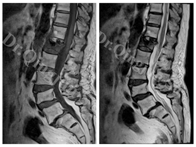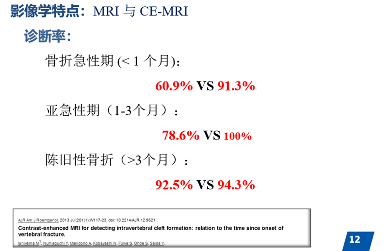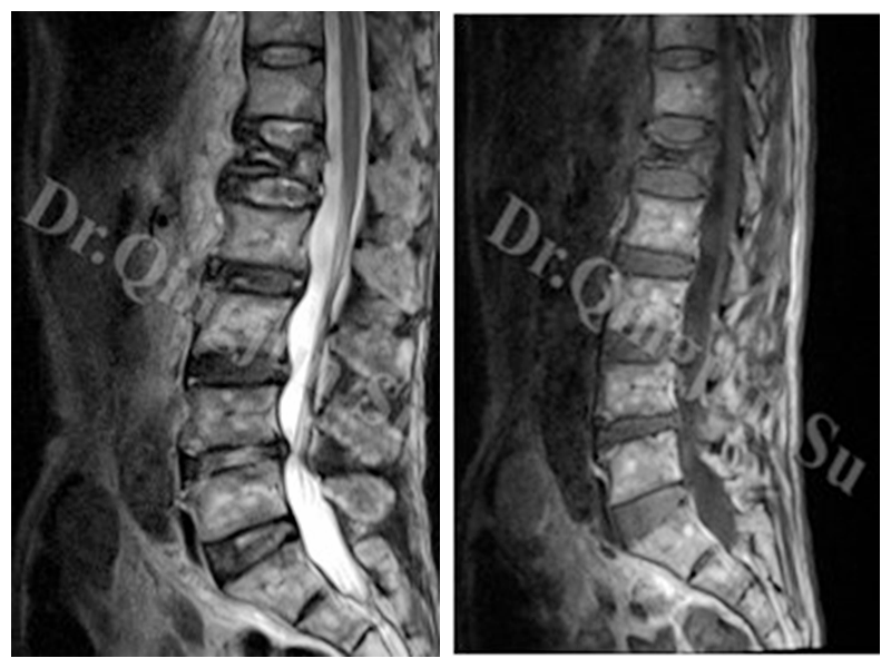 •另一种观点认为,急性期患者伤椎周围水肿严重,患者仰卧位时液体快速积聚在裂隙内,此类患者核磁T2相上呈高信号;而骨折时间较长的患者仰卧位时,液体往往需要更长的时间才能慢慢聚集到裂隙内,核磁显示为T2相上的低信号。