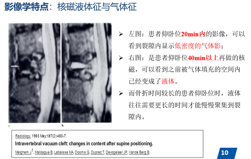•Yu等认为裂隙内液体征象和裂隙内气体征象是压缩骨折后椎体内骨坏死的两个阶段。早期出现液体征,随着塌陷的进展,裂隙周围的松质骨硬化、塌陷,阻止渗出液进入椎体,裂隙内出现气体。