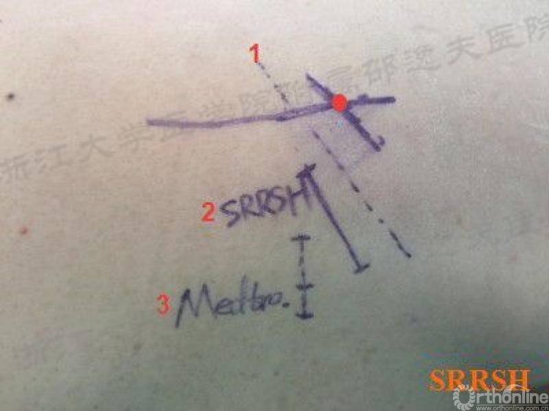 图2 切口示意图:红色圆点,L45椎间隙中心点体表位置;1,髂嵴线;2,邵医OLIF切口;3,美敦力OLIF切口