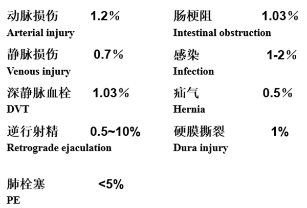 XLIF的不足主要体现在由于髂骨阻挡,不能用于L5/S1区域的处理;腰大肌内走行有腰丛神经分支,尤其L4/5节段,需要注意;术后可能出现大腿疼痛、麻木、无力;腰大肌内有血管垂直分布在椎间盘的侧方;穿刺、扩张过程可能损伤血管,出现出血、血肿的情况。