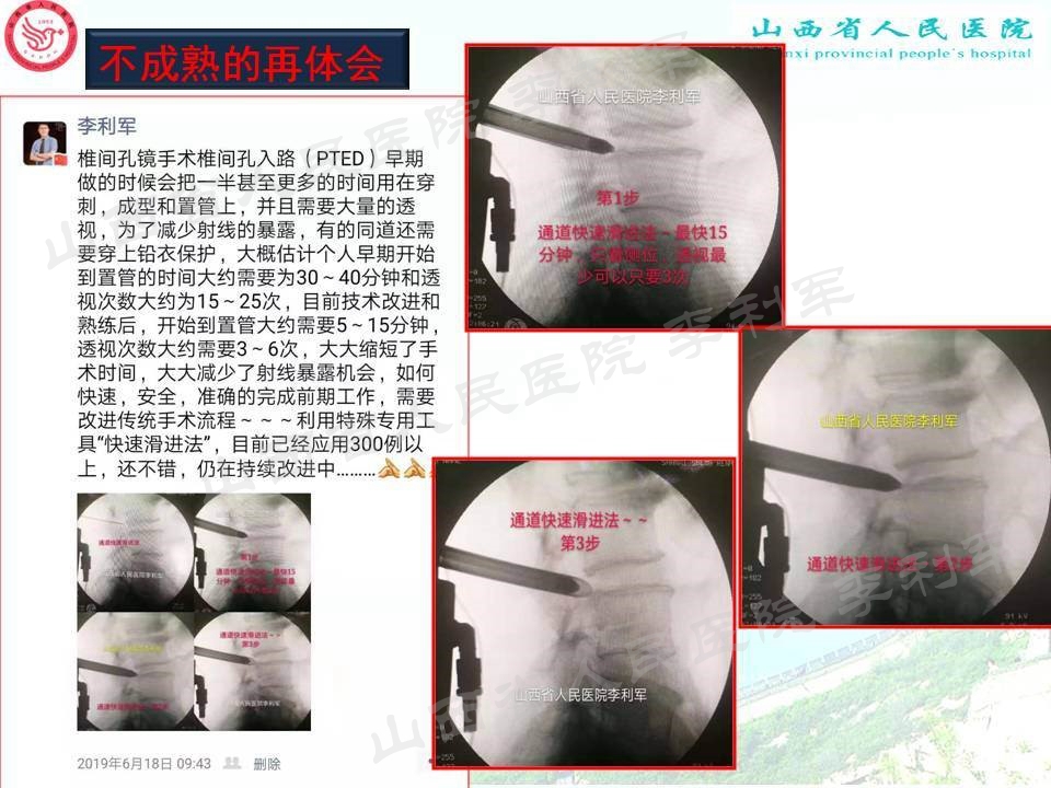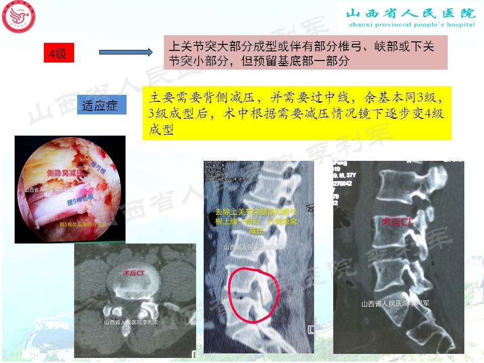 山西省人民医院骨科李利军医生根据自己的临床经验体会发现根据术前的影像、临床症状体征、手术需要减压的范围及术中的操作情况,在保证良好减压的情况下可以做到分级成型,进一步体现了微创手术的微创化理念,并根据这些经验体会总结出PTED按需成型5级法,因为属于初步体会,不足之处很多,希望得到各位老师及同道的批评指导。