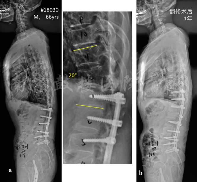 图1 男,66岁,半年前因腰椎管狭窄于当地医院行L1-S1内固定减压融合术,术后2年出现近端交界性后凸,PJA角度20°,伴T12-L1椎管狭窄;于我院行翻修术,去除松动的L1螺钉,行T12-L1 TLIF并将内固定上延至T10,术后1年无PJK(b)