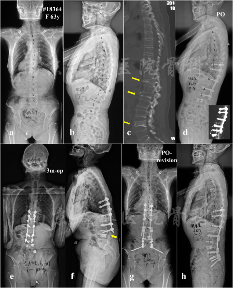图2 女,63岁,多发骨质疏松性骨折(T11,L1,L4),类风关病史,长期服用激素(b, c);初次手术行骨折切开复位内固定(T9-L3),其中T9,T10,L2及L3均使用骨水泥螺钉加强,L4椎体行骨水泥注入(d);术后3个月出现远端交界性失败(DJK),L3螺钉拔出,矢状面躯干失平衡(e, f);行翻修术,将内固定延长至骨盆并使用S2AI螺钉固定,L4/5及L5/S1行TLIF支撑(g, h)