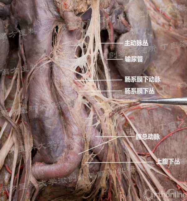 上腹下丛由腹主动脉丛、肠系膜下丛及双侧的第3、4腰内脏神经组成。位于主动脉分叉前,第5腰椎和骶岬及左、右髂总动脉之间在腹正中线右侧分布的神经纤维少。