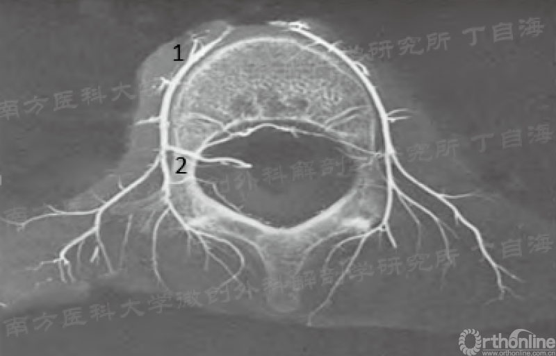 椎间孔动脉的来源和走行(1.腰动脉 2.椎间孔动脉)