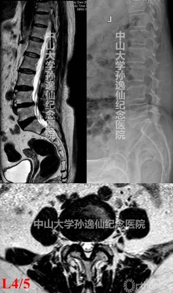 图1:腰椎过伸过曲位X线片提示L4椎体I度前滑脱,腰椎MR提示L4/5椎间盘突出