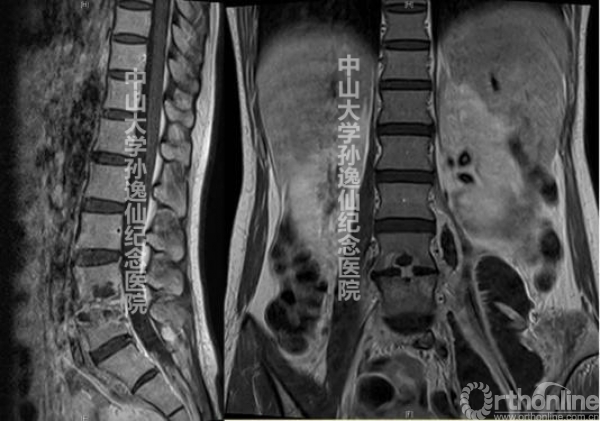 图2:MR检查提示L4/5椎体感染性病变,结核可能,并左侧腰大肌结核性脓肿形成,左侧腹股沟区流注脓肿形成