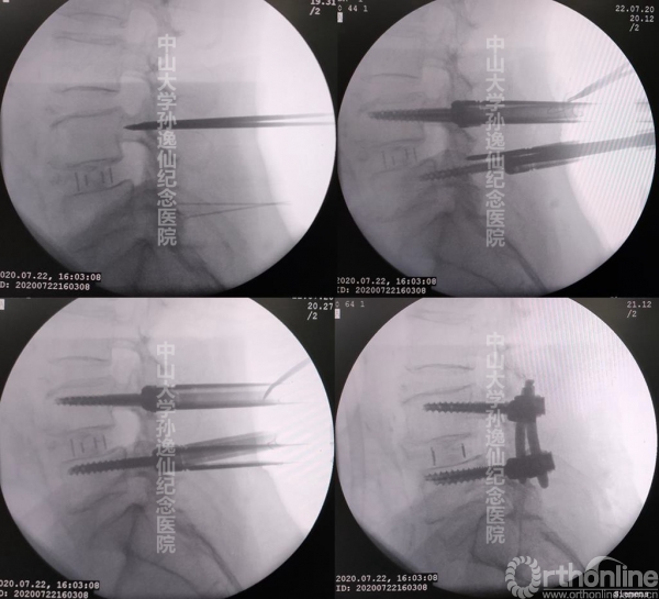 在XLIF/OLIF联合后路椎弓根钉棒内固定的手术过程中,术者通常选择先于侧卧位完成XLIF/OLIF而后转为俯卧位完成置钉。此转换手术体位的过程,是该手术方式的主要限速步骤,不仅影响术者的手术节奏、增加不必要的时间消耗,同时因麻醉或手术时间的延长而增加并发症的风险;而且体位转换的过程还伴随着融合器移位的潜在风险。为应对上述问题,本文作者手术团队通过单一侧卧体位下完成XLIF/OLIF及经皮双侧椎弓根钉棒内固定,特于此分享病例2例。