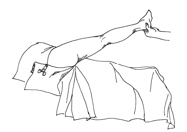 ⑤用一剖腹单使患侧脚穿出洞口后,将洞口后侧拉到臀部,以手在髂嵴处按着剖腹单的洞口上部,打开剖腹单的上、下部,上部遮盖腹、胸和头架,下部遮盖健侧下肢和手术台尾部。收紧洞口,用巾钳固定。