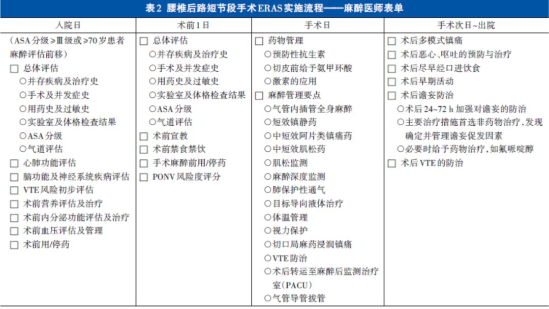 需要强调的是,该共识所涉及术式的实施流程需要脊柱外科医师、麻醉医师、病房与手术室护士、康复医师等多个科室成员共同配合完成,为了更便于临床操作,特制定了各科室成员的表单,详见表1~5。