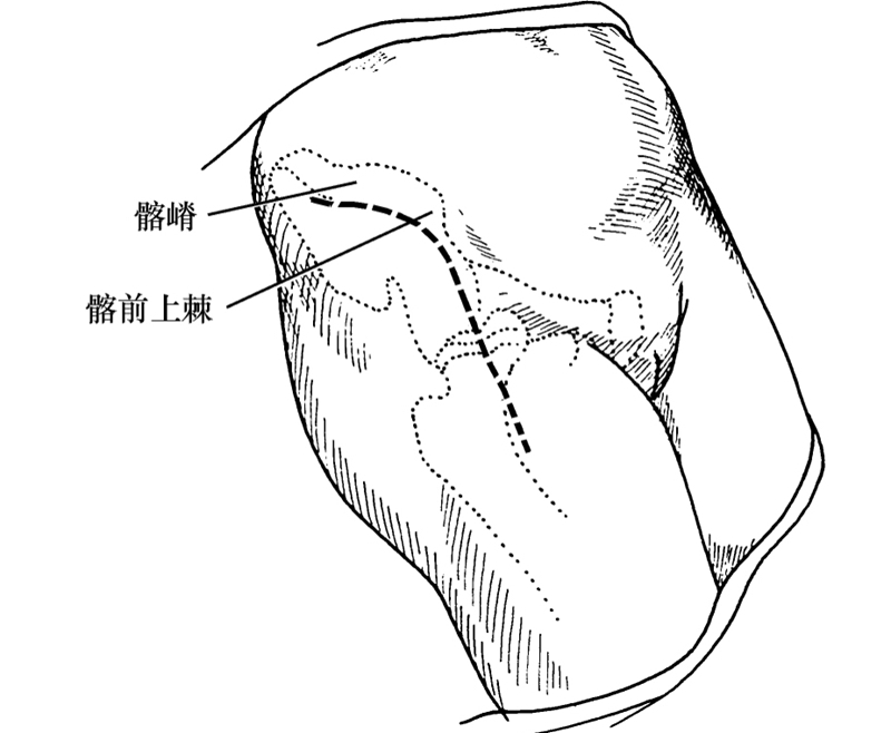 由髂嵴前半部向前经髂前上棘向远端延伸8~10cm,切口指向髌骨的外侧缘(图8-1-2)。若手术野显露更广泛时,可将切口向髂嵴延伸。