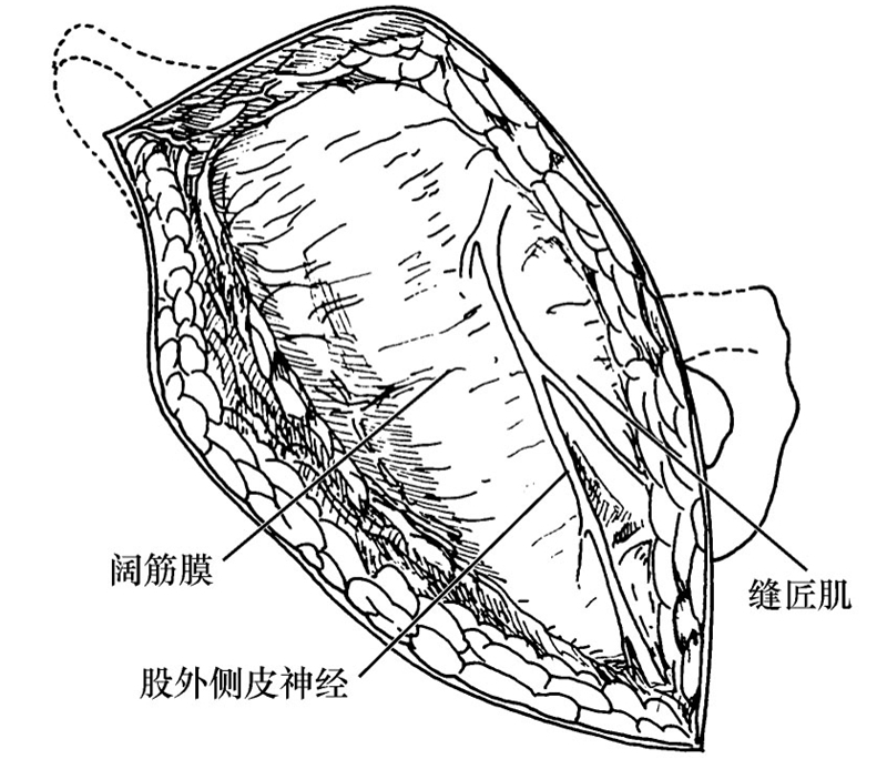 切开皮肤、皮下组织,外旋下肢使缝匠肌紧张便于辨认,沿阔筋膜张肌和缝匠肌之间的间隙钝性分离。股外侧皮神经紧邻肌间隙穿出深筋膜,应避免损伤(图8-1-3)。