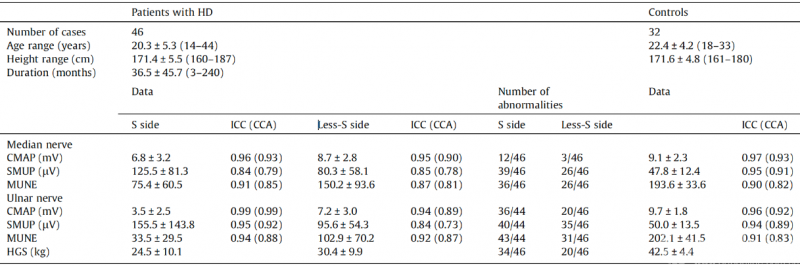 平山病患者平均SMUP波幅比健康受试者的平均值高两个标准差(SDs),或CMAP波幅、运动单位数目和握力比健康受试者的平均值低两个SDs即定义为异常。