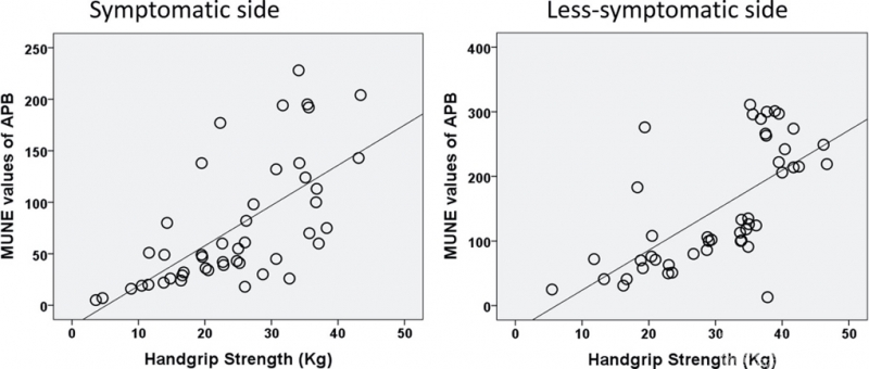 图2.平山病患者两侧APB MUNE值与同侧手握力的相关性。发现病例组两侧MUNE值与同侧手握力有显著的正相关关系