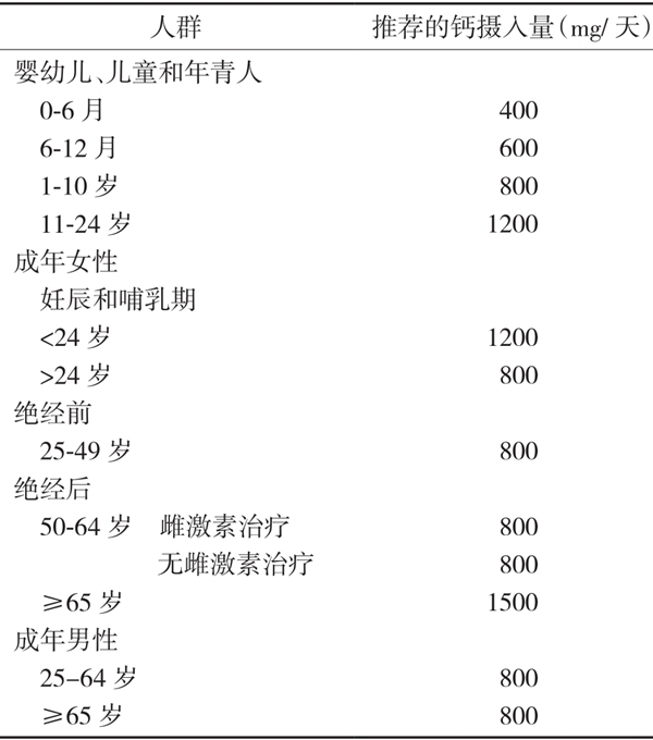 骨量的峰值是骨折风险的一个重要决定因素。骨量峰值的70%~80%由遗传决定,但钙摄入量能决定骨量峰值的20%~30%。钙的基本摄入量必须满足维持成年时的骨量,减少老年时的骨量丢失(表4-1-3-3)。