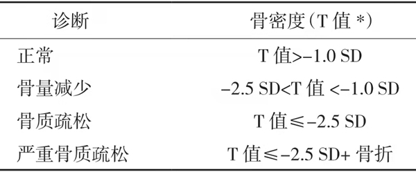 DEXA 报告提供T值和Z值。T值为与同性别同种族(不同年龄)对照相比,高于或低于其平均骨密度的标准差数值,而Z值则是与同性别同种族同年龄人群相比,高于或低于其平均骨密度的标准差数值。根据这些数值可以将患者分成三类:正常、骨量减少和骨质疏松(表4-1-3-2)。