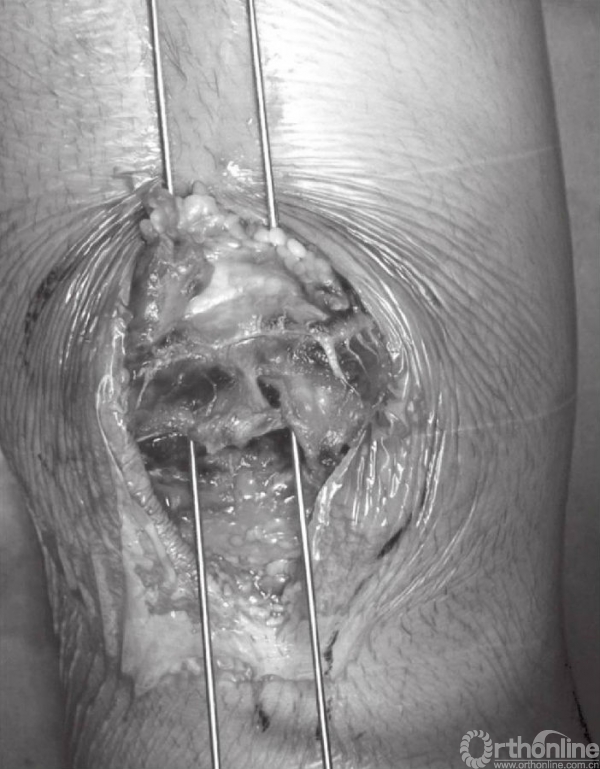 深层显露切口与皮肤切口方向一致。锐性分离深层筋膜,并牵开皮肤组织,进一步切开髌骨囊并清除血肿后骨折端即可显露(图4A和B)。此时,可见髌骨骨折以及撕裂的韧带。以生理盐水清洗血肿以及血凝块(图5)。撕裂的支持带可先辨识后,再进行修复。