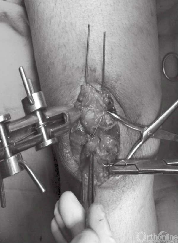 图9 在复位钳的帮助下完成髌骨骨折复位以及临时固定