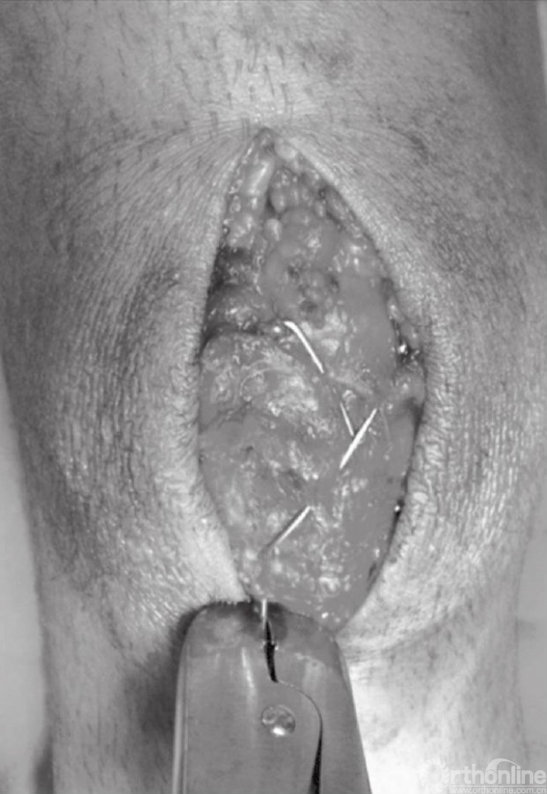 图18 在髌骨两侧用不可吸收缝线缝合撕裂的支持带