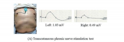 图3(A):经皮膈神经刺激试验显示,右侧膈神经振幅较左侧下降50%以上