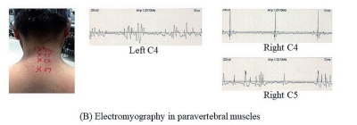 图3(B):椎旁肌肌电图显示C4处有晚募集和多相运动单元动作电位