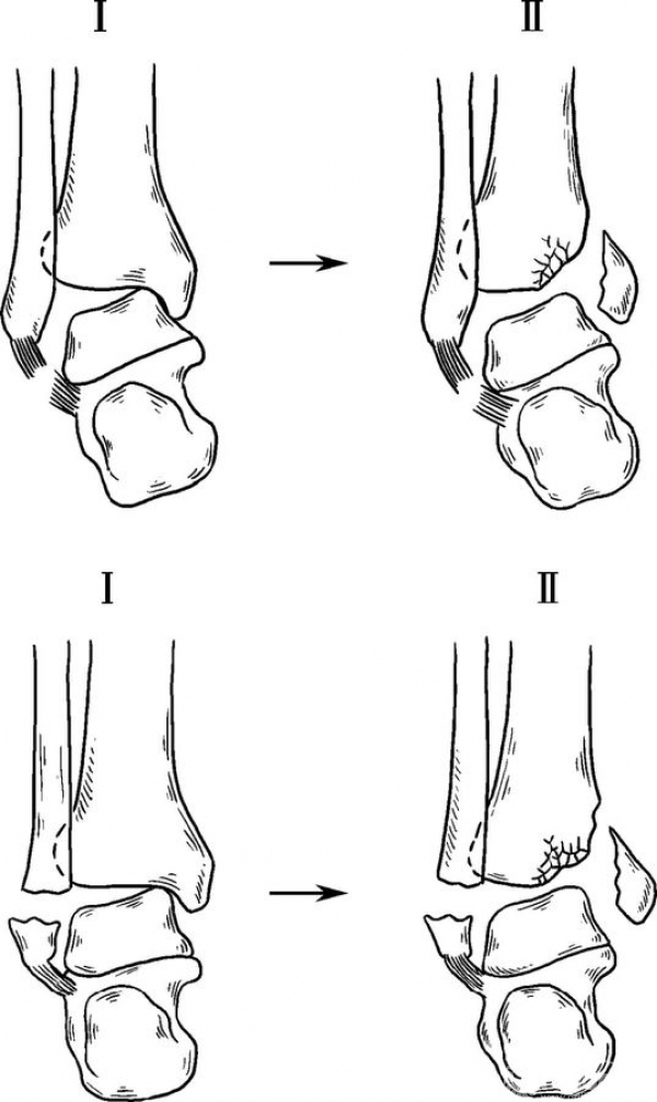 旋后是指距下关节内翻、胫距关节内旋和前足内收,此时第一跖骨及足心朝向头侧,第五跖骨向尾侧。此位置时踝外侧结构绷紧,在旋后和内收外力作用下,首先会造成外侧副韧带断裂或发生外踝撕脱骨折、横形骨折。骨折在下胫腓联合韧带下方,下胫腓韧带仍保持完整。进一步的内收距骨撞击关节内侧,结果造成与距骨内角垂直的骨折线,有时会造成胫骨远端内侧关节面压缩,也可能造成距骨软骨下压缩性骨折。旋后—内收型骨折分两度(图1)。