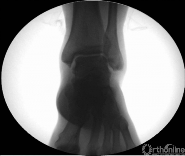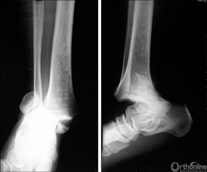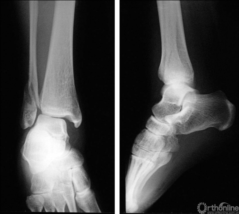 X线诊断:标准的踝关节影像学评估应包括3个位相:前后位(图5),踝穴位(内旋15°)(图6),侧位(图7)。