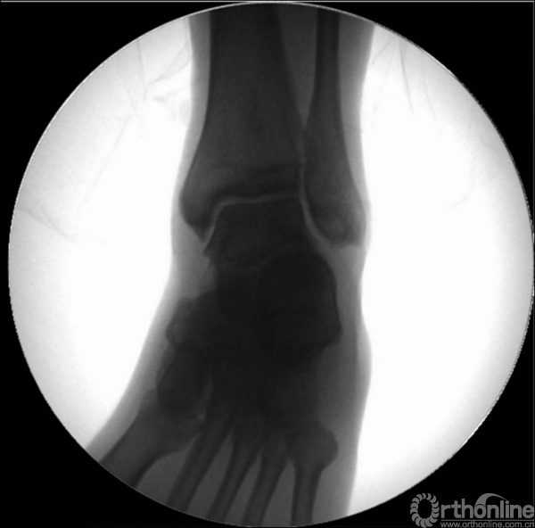 ②外踝解剖复位后腓骨远端内侧与距骨外侧缘形成“圆币征”。同时根据腓骨骨折线远近端骨皮质的厚度来判断有无腓骨的旋转。