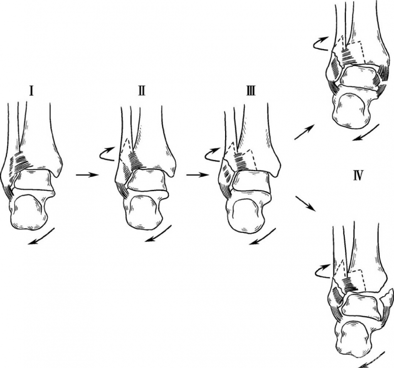 踝内侧首先损伤,继而下胫腓前联合韧带断裂或前结节撕脱骨折,随后腓骨骨折,骨折线位于胫腓联合上方。腓骨骨折线斜形,但从前上到后下。骨间韧带损伤。外力如继续可造成下胫腓后联合断裂,或胫骨后外侧撕脱骨折。