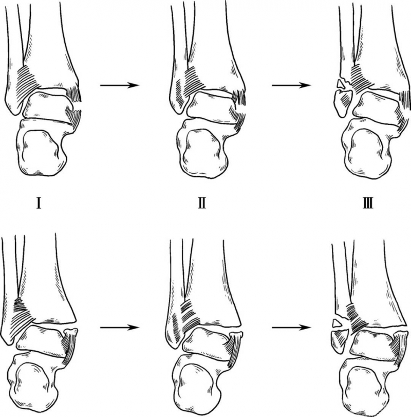 以旋后外旋型为例,当患者患足受伤时,患足正处于旋后位(即足心及足趾朝向人体中线位置)又受到迫使足外旋的外力(即距骨沿着小腿中轴线向外旋转,实际是胫骨向内侧旋转,距骨相对向外旋转)就造成这种类型的骨折。