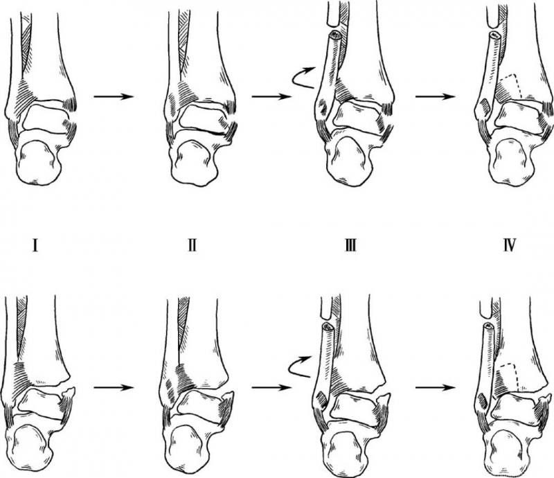 旋后—外旋型闭合复位,按外踝-内踝-后踝-下胫腓联合的顺序进行。