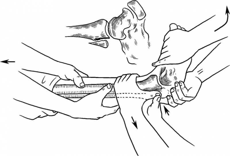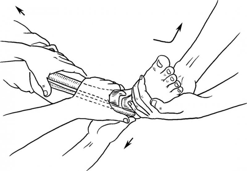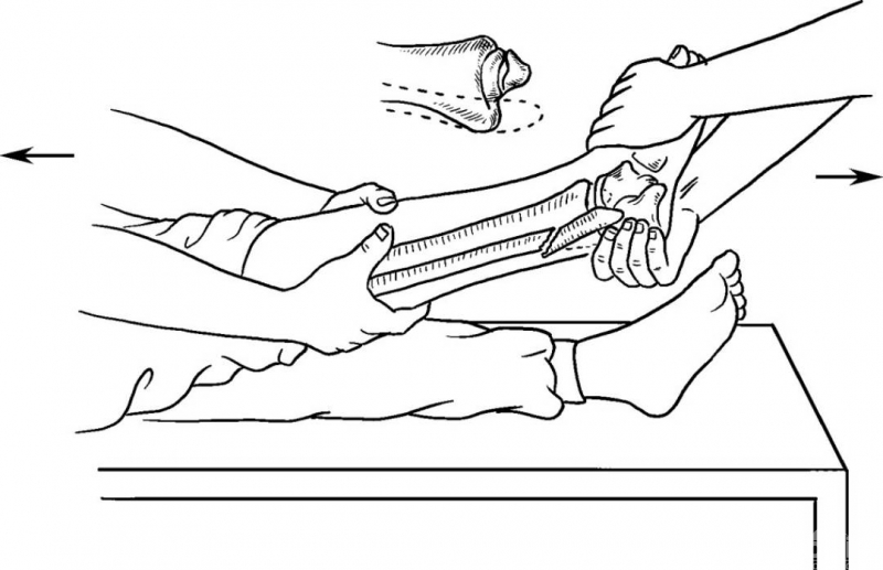 旋后—内收型按内踝-外踝的顺序进行。以旋后—外旋型Ⅳ度为例,患者仰卧,屈膝90°以使小腿三头肌放松。两助手分别握持大腿腘部与足部,按骨折畸形方向顺势牵引(牵引力量不能过大,以免加重损伤)。
